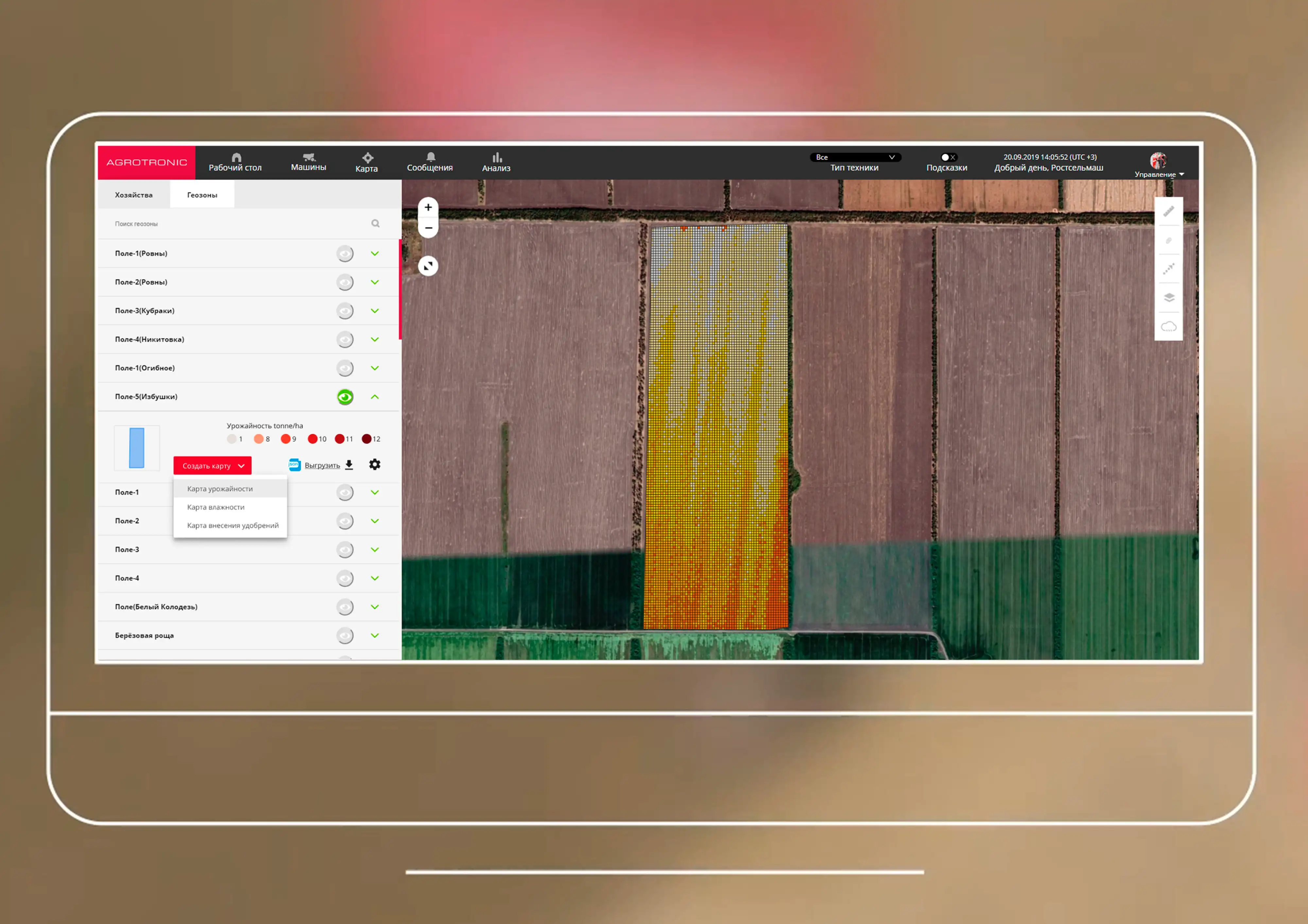 Повышения эффективности и производительности кормоуборочного комбайна можно достигнуть, установив пакет электронных опций, в который входит РСМ Карта урожайности. Данные о текущей производительности комбайна, текущей влажности кормомассы и количестве сухого вещества в тоннах, полученные от системы картирования, служат для контроля настроек технологического процесса: регулирования внесения силосных добавок, изменения длины резки и контроля степени износа ножей.